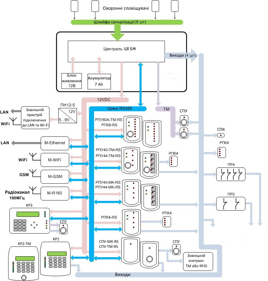 Є два типи фізичної реалізації виходів – «відкритий колектор» (для малопотужних навантажень зі струмом до 50мА) та «світлодіодний індикатор» (для безпосереднього підключення світлодіодів). На централі є 3 виходи «відкритий колектор» та вихід «світлодіодний індикатор». На пристрої доступу розташовані модифіковані виходи «відкритий колектор», що дозволяють підключення навантажень зі струмом до 3А. Для управління сильноточним навантаженням і для гальванічної розв'язки використовуються плати реле ПР2 та ПР4, що містять у своєму складі 2 та 4 реле. Алгоритм роботи кожного виходу визначається користувачем відповідно до типів роботи: «індикація тривоги» (керування сиреною та індикатором тривожної кнопки), «режим охорони» (індикатор на вхідних дверях) і «керований користувачем» (керування електрозамком).