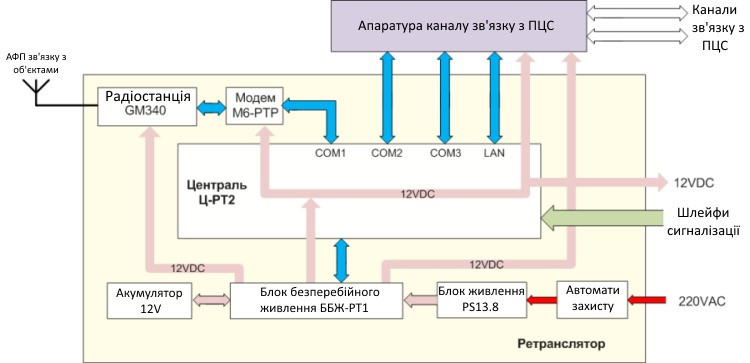 Для підвищення надійності роботи можливе використання резервного каналу зв'язку із ПЦС. Якщо до різних портів централі підключена апаратура для кількох каналів зв'язку, можна реалізувати автоматичне підключення резервного каналу №1 при зникненні основного каналу і резервного каналу №2 при зникненні інших каналів. Це робиться конфігуруванням параметрів у модулі FLASH пам'яті централі. При цьому вибирається порт підключення основного каналу (СОМ2 чи LAN централі), а також порти підключення резервного каналу №1 і №2. При використанні радіоканалу зв'язку з ПЦС, можливість резервування каналів відсутня. Джерела живлення – змінна напруга 187…242В та акумуляторна батарея. Мережева напруга, пройшовши через автомати захисту, надходить на блок живлення типу PS13.8 фірми PULSE, де перетворюється на постійну напругу 13,8В. Вихідна напруга блоку живлення, через блок безперебійного живлення ББЖ-РТ1, розподіляється для живлення всіх споживачів посту ретрансляції. При відключенні напруги автоматично відбувається перехід на живлення від акумулятора, а при появі напруги повернення назад. При зниженні напруги нижче 10,5В відбувається автоматичне відключення від акумулятора. Здійснюється автоматичне заряджання розрядженого акумулятора.