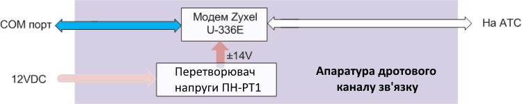 Виділена лінія, хоча б на кінцевих ділянках, має бути у вигляді двопровідної мідної лінії. Для збільшення дальності лінії допустиме використання стандартних підсилювачів, що входять до комплекту обладнання АТС за умови забезпечення смуги пропускання сигналів 0,3…3,4кГц. З'єднання забезпечується за допомогою пари однакових стандартних модемів виділеної лінії, які підключені на кінцях зазначеної лінії. На ПЦС та ретрансляторі ці модеми підключаються через COM порти до обробних блоків ПЦС та ретранслятора. Рекомендується використання модему виділеної лінії U-336E фірми Zyxel. В цьому випадку необхідно застосування перетворювача напруги ПН-РТ1 (формуючого напругу живлення +14В і мінус 14В з вхідної напруги +10 ... 14В) для живлення модему. Пара таких модемів має бути попередньо налаштована за допомогою АТ команд для роботи в комплекті.
