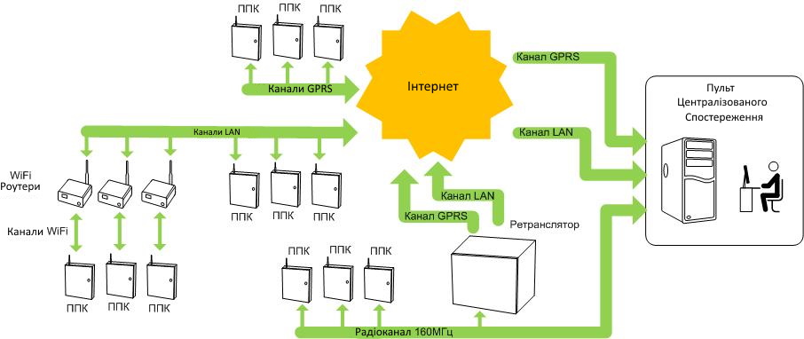 Передача інформації від ПЦС до ППК можлива радіоканалом або каналами Інтернет (провідний канал або канал GPRS). Підключення ПЦС до Інтернету здійснюється через будь-яку стандартизовану апаратуру, яка виконує таку функцію, наприклад, через локальну мережу, що містить шлюз, або через USB порт та GPRS модем – при підключенні до мобільного Інтернету. У будь-якому випадку, для роботи необхідне використання статичної IP адреси.